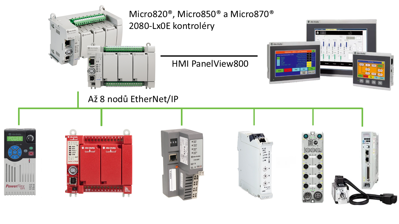 V katalogu najdete nové přístroje pod zkratkou 2080-Lx0E. Micro820® je označováno jako L20E, Micro850® je označováno jako L50E, Micro870® naleznete jako L70E. Pod písmenem E se skrývá zkratka Ethernet, aby bylo na první pohled jasné, že kontrolér tuto funkci umožňuje.