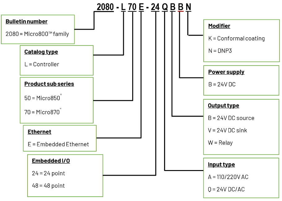 Micro820® ve vylepšené verzi L20E obsahuje stejný počet I/O, navíc ale přibyla konektor USB typu C. Micro850® se ve starším i novějším provedení nabízí s 24 nebo 48 vstupy/výstupy, k napájení vyžaduje 24 V stejnosměrného napětí, resp. 110/220 V napětí střídavého. Na výstupu můžete vybírat mezi source/sink 24 V DC, případně zvolit variantu s relé výstupy. Micro870® nabízí stejné možnosti napájení, na výstupu chybí možnost zvolit tranzistorový typ sink, navíc se nabízí pouze s 24 vstupy/výstupy. Zde může být jejich počet navýšen až na 304 díky rozšíření až o 8 rozšiřujících modulů. Kontrolér Micro850® může být rozšířen jen na celkových 192 I/O (4 rozšiřující moduly).